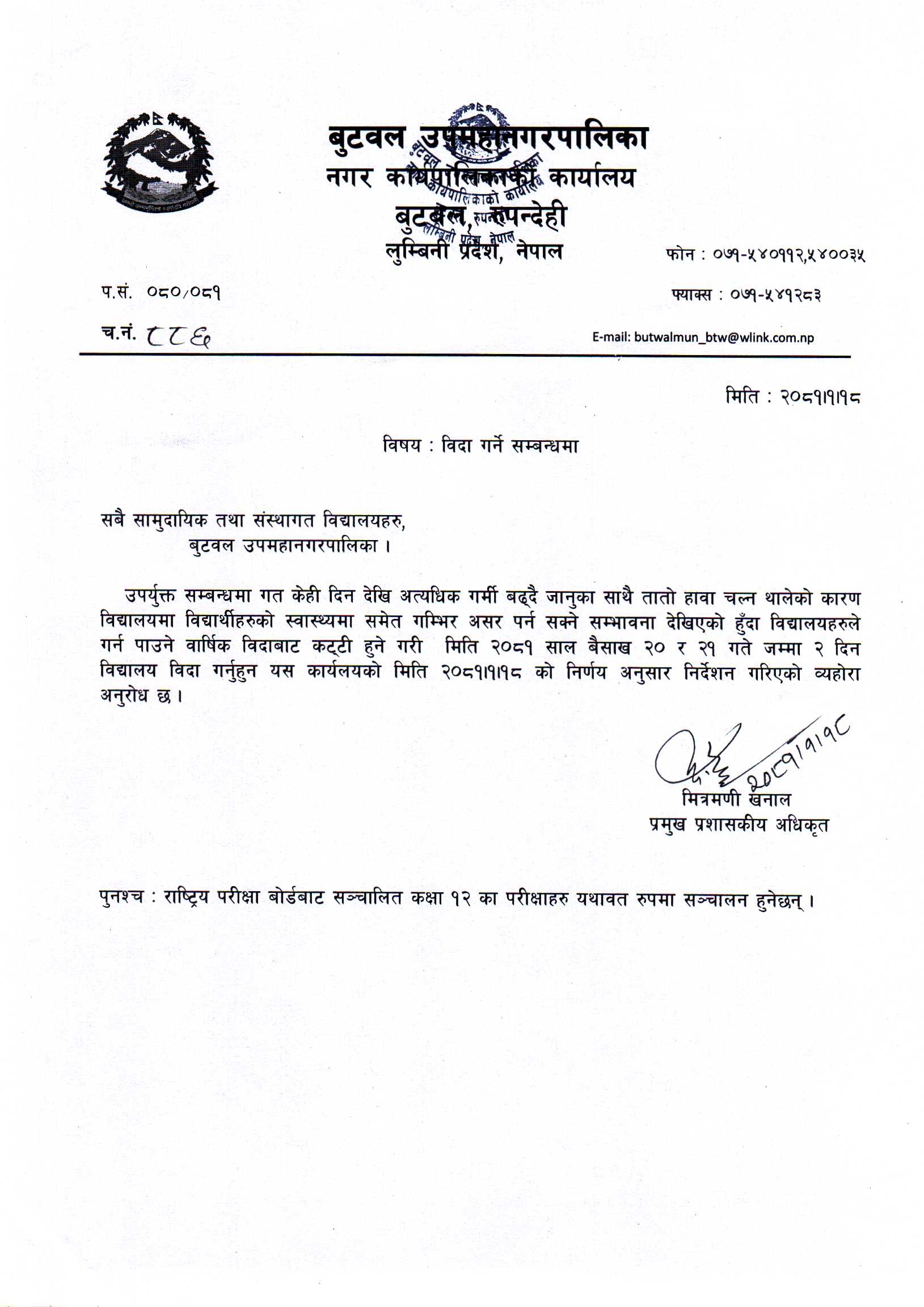 उपमहानगरका प्रमुख प्रशासकीय अधिकृत मित्रमणि खनालले केही दिनयता तातो हावा चल्न थालेकोले विद्यार्थीहरूको स्वास्थ्यमा गम्भीर असर पर्नसक्ने देखिएको भन्दै वैशाख २० गते बिहीवार र २१ गते शुक्रवारका लागि नगरभित्रका सबै विद्यालयमा बिदा दिन निर्देशन दिएको बताएका छन ।