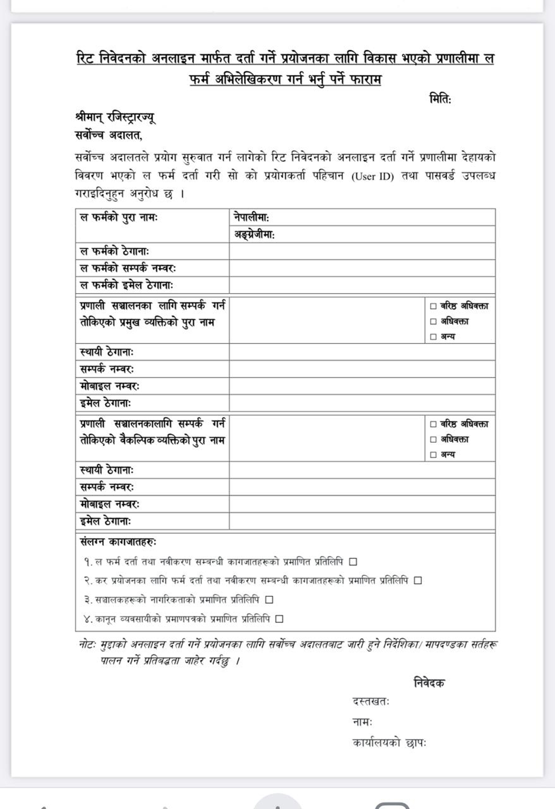 सर्वोच्चले यसका लागि ल फर्म अभिलेखीकरण गर्ने प्रक्रिया अगाडि बढाएको छ । अनलाइनबाटै रिट निवेदन दर्ताका लागि सबै ल फर्महरूलाई अभिलेखीकरणमा आउन सर्वोच्चले बोलाएको छ ।