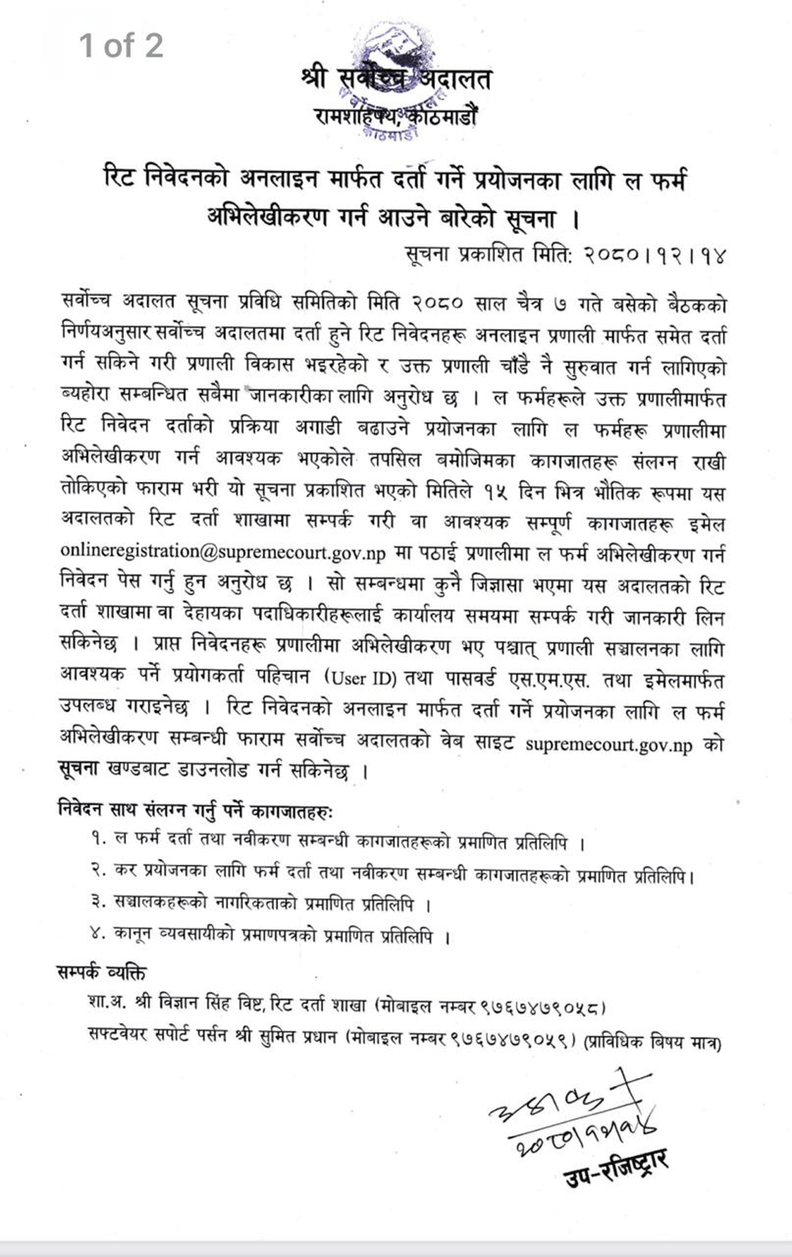 उक्त प्रणाली मार्फत रिट निवेदन दर्ताको प्रक्रिया अगाडि बढाउने प्रयोजनका लागि ल फर्महरू अभिलेखीकरण गर्न आवश्यक कागजातहरू सहित एउटा फाराम भरेर १५ दिनभित्र अदालतको रिट दर्ता शाखामा सम्पर्क गर्न सर्वोच्चले सूचना जारी गरेको छ ।