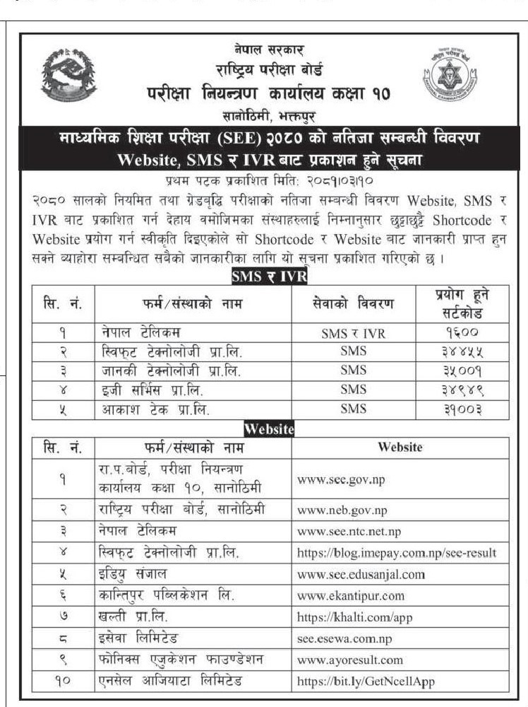 परीक्षा नियन्त्रण कार्यालय कक्षा १० ले एसईई परीक्षा २०८० को नतिजा बोर्डको वेबसाइट, एसएमएस र आईभीआर बाट हेर्न सकिने गरी प्रकाशन गर्ने भएको छ ।