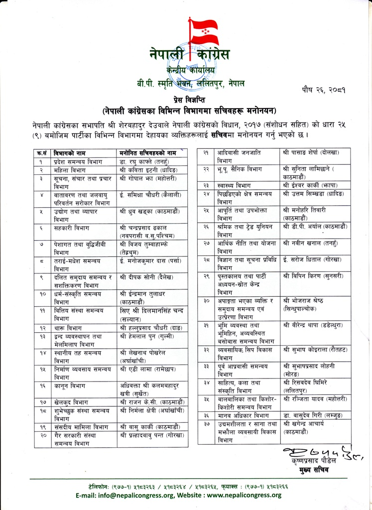 २६ पुष, काठमाडौँ । नेपाली कांग्रेसले ३७ विभागमा सचिव मनोनयन गरेको छ ।