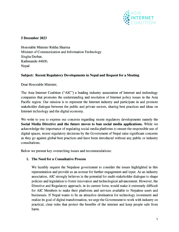 एआईसी सामाजिक सञ्जाल प्लेटफर्महरुको संस्था हो । नेपालमा सामाजिक सञ्जाल नियमन निर्देशिका र सामाजिक सञ्जालमा प्रतिबन्ध लगाउने नेपाल सरकारको निणर्य प्रति आपत्ति जनाएको हो ।