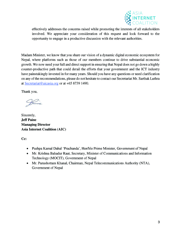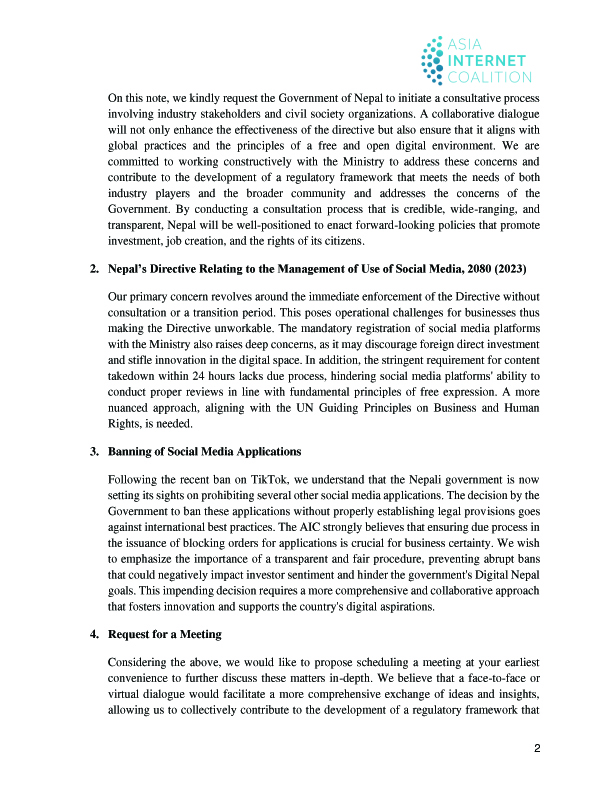 पत्रमा नेपाल सरकारले सामाजिक सञ्जालसँग सम्बन्धित उद्योग र नागरिक समाजसँग आवश्यक छलफल नगरि र तयारीका लागि समय नै नदिइ निर्देशिका र प्रतिबन्ध लगाउने निणर्य लागू गरिएको भन्दै आपत्ति जनाइएको छ ।