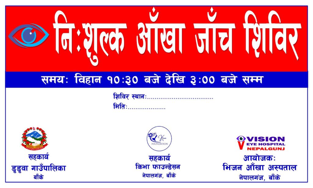 भिजन आँखा अस्पताल नेपालगञ्जको आयोजना, किभा फाउन्डेसन नेपालगञ्ज र डुडुवा गाँउपालिकाको सहकार्यमा निःशुल्क आँखा जाँच शिविर सञ्चालन हुन लागेको हो ।