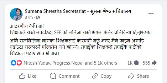 उनले लेखेकी छन्, ‘आदरणीय केपि बा ! शिक्षकले राम्रो नपढाँउदा एसईईको नतिजा राम्रो भएन भनेर प्रतिक्रिया दिनुभएछ। अनि राजनीतिमा लागेका शिक्षकलाई कारबाही गर्छु भनेर मैले फाइल अगाडि बढाँउदा सरकारनै परिवर्तन गर्न खोज्ने। तपाइँको शिक्षकले तपाइँकै पार्टीको सिद्धान्त पढाए मात्र हो अब ।’