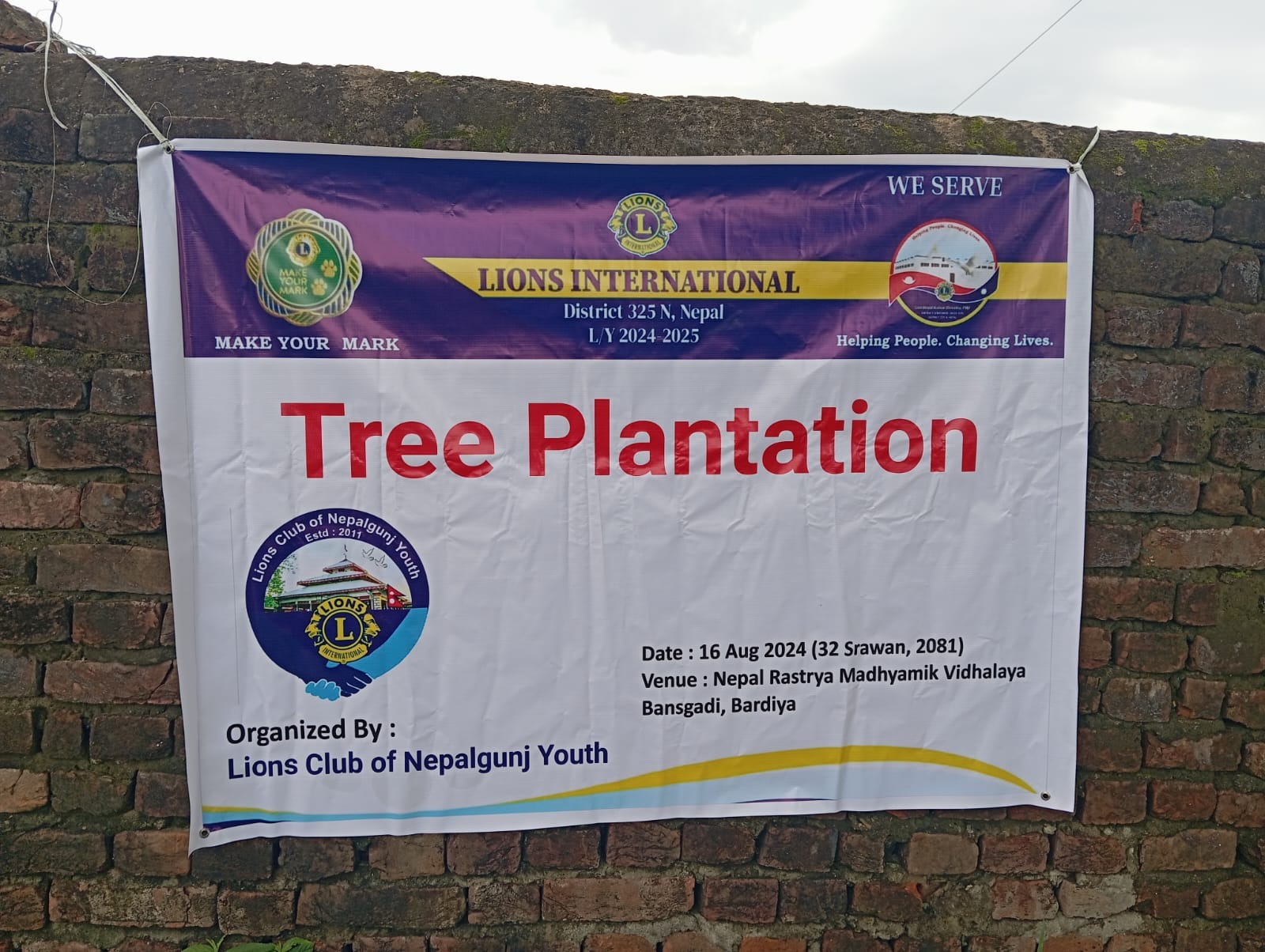 साउन ३२ गते शुक्रबार लायन्स क्लब अफ नेपालगञ्ज युथको आयोजनामा बर्दिया बाँसगढी नगरपालिका वडा नं. २ स्थित जनता माध्यमिक विद्यालय बनमुढवाको परिसमा लगभग ६० वटा विभिन्न जातका बिरुवाहरु लगाईएको छ ।