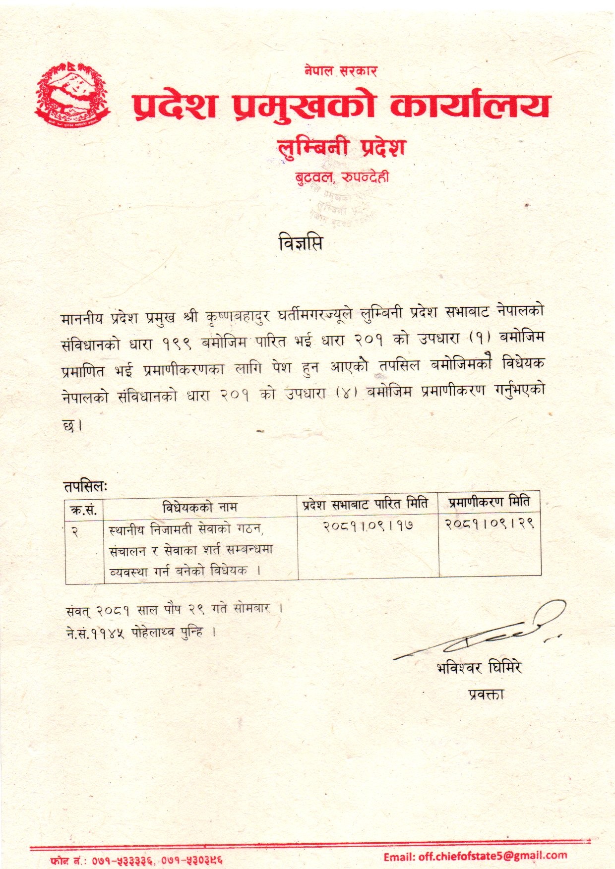 उक्त विधेयक पुस १७ गते प्रदेश सभाबाट दोस्रो पटक हुबहुँ पारित भएको थियो । नेपालको संविधानको धारा १९९ बमोजिम पारित भई धारा २०१ को उपधारा (१) बमोजिम प्रमाणित भई प्रमाणीकरणका लागि पेश हुन आएको विधेयक प्रमाणीकरण गरेको प्रदेश प्रमुख कार्यालयका प्रवक्ता भविश्वर घिमिरेले जानकारी दिए ।