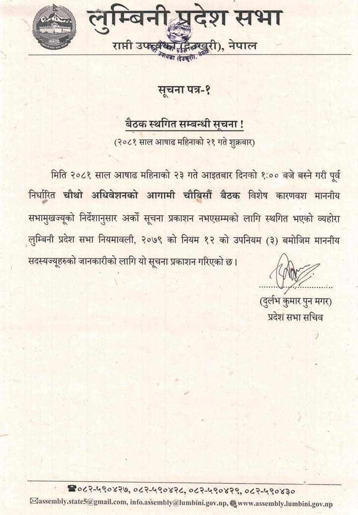 लुम्बिनी प्रदेश सभा नियमावली २०७९ को नियम १२ को उपनियम ३ बमोजिम स्थगित गरिएको पुनले जानकारी दिए ।