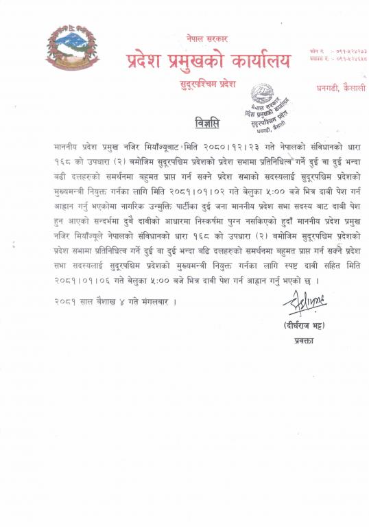 प्रदेश प्रमुख नजिर मियाँले चैत्र २३ गते नेपालको संविधानको धारा १६८ को उपधारा (२) बमोजिम सुदूरपश्चिम प्रदेशको प्रदेश सभामा प्रतिनिधित्व गर्ने दुई दुई भन्दा बढी दलहरुको समर्थनमा बहुमत प्राप्त गर्न सक्ने प्रदेश सभाको सदस्यलाई सुदूरपश्चिम प्रदेशको मुख्यमन्त्री नियुक्त गर्नका लागि बैशाख २ गते बेलुका ५ बजे भित्र दाबी पेश गर्न आह्वान गरेका थिए ।
